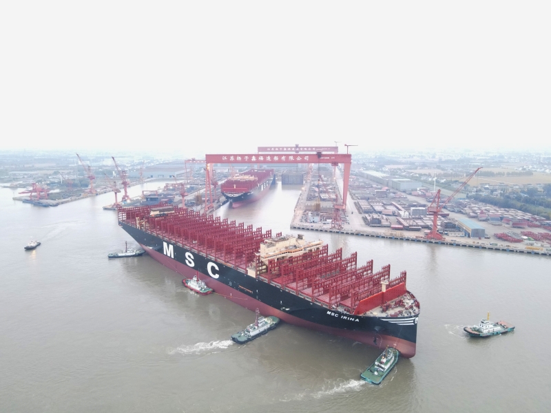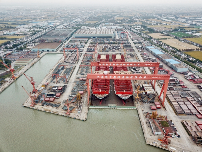 目前,江苏扬子江船业集团公司手持该船型订单6艘,创汇8.64亿美元。该型船总长399.99米,型宽61.3米,型深33.5米,结构吃水17米,服务航速22.5节,入级DNV船级社,载重量近240000吨,一次可装载创纪录的24346只标准集装箱,是名副其实的海上“巨无霸”和“带货王”。本次出坞的2艘将于11月完成后续舾装、试航后交付船东,另外4艘预计将在2023年交付。