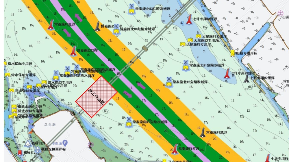 过往船舶可以通过甚高频06频道与施工船舶联系,也可以通过甚高频09频道与常州海事局指挥中心联系。