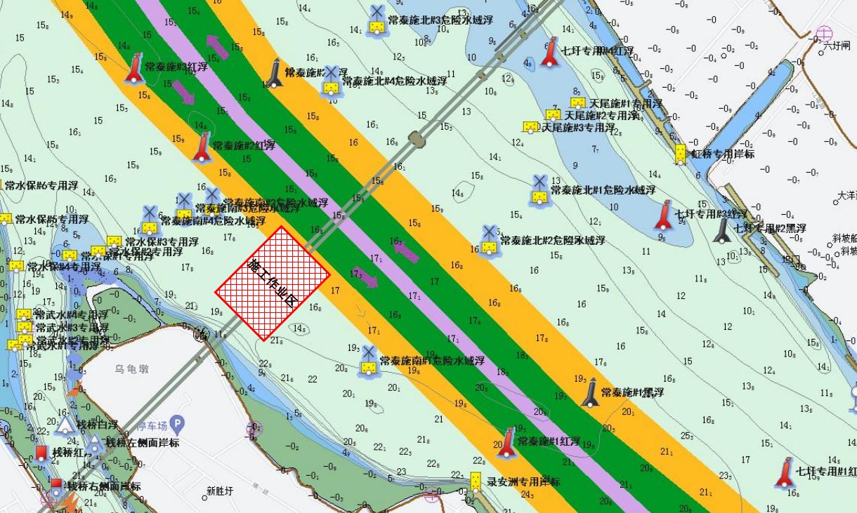 过往船舶可以通过甚高频06频道与施工船舶联系,也可以通过甚高频09频道与常州海事局指挥中心联系。