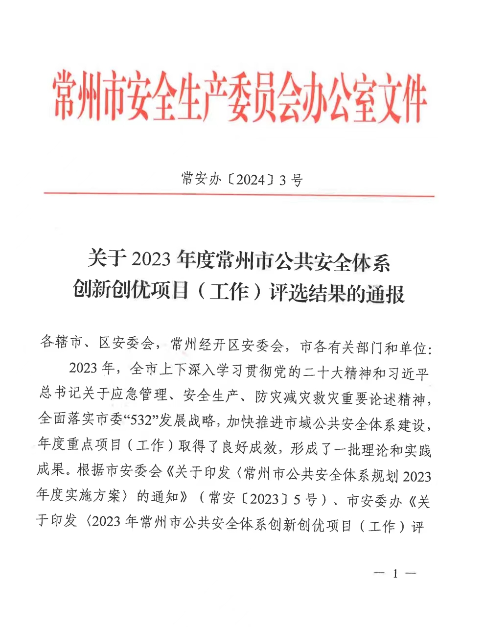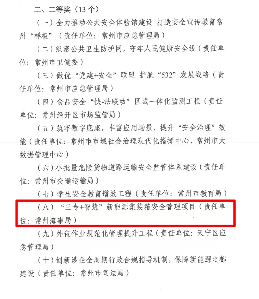 日前,常州市安全生产委员会办公室印发了《关于2023年度常州市公共安全体系创新项目(工作)评选结果的通报》,常州海事局《“三专+智慧”新能源集装箱安全管理项目》荣获二等奖。