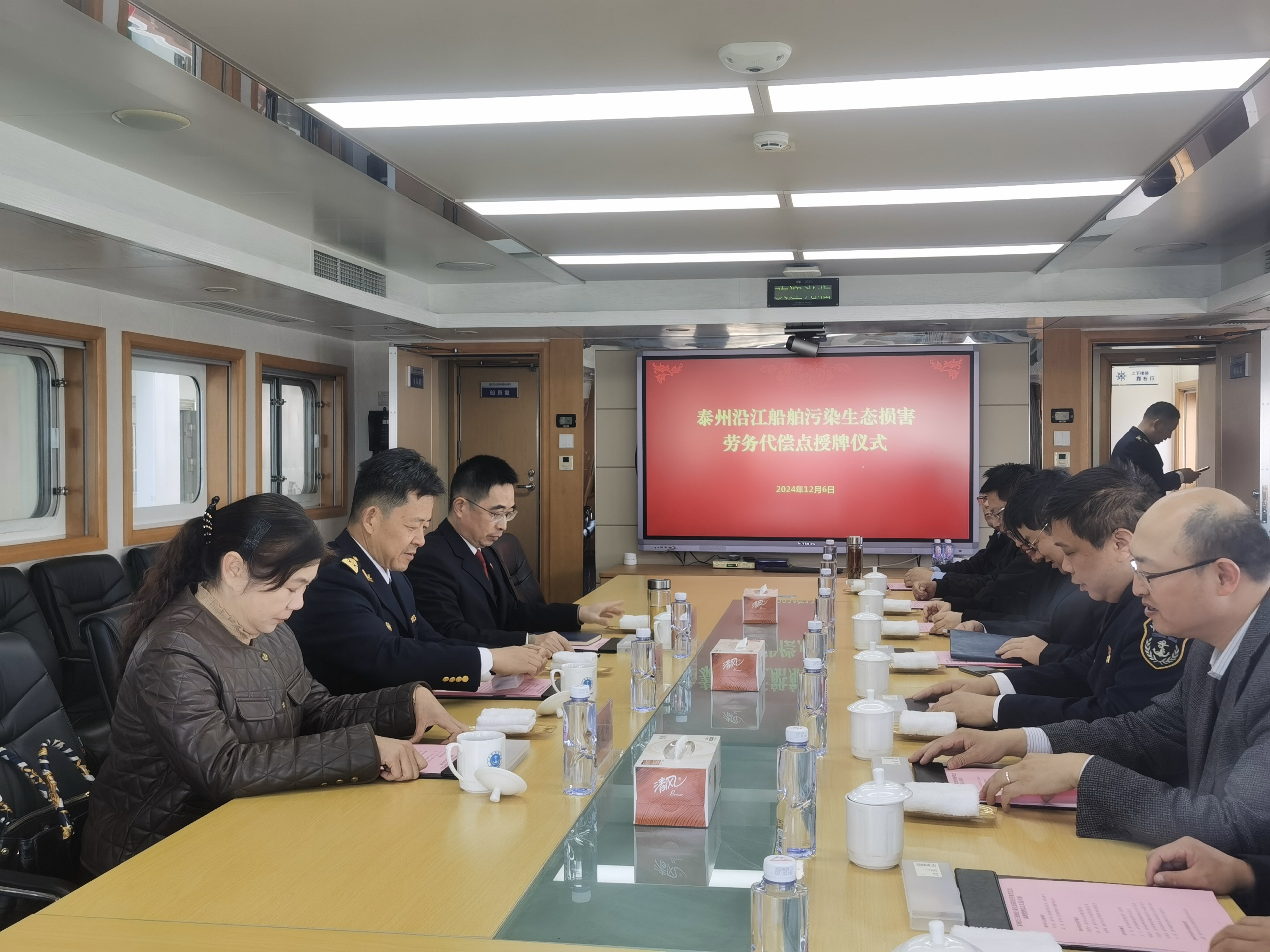 12月6日,在泰州海事局、泰州市生态环境局和泰州市人民检察院共同推进下,全国首个船舶水污染生态环境损害劳务代偿点在泰州正式设立,泰州市水利局、农业农村局等7家单位代表共同见证,并同步完成了首起船舶生活污水直排长江生态损害劳务代偿案件。