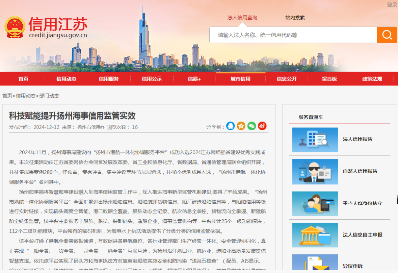 近日,扬州海事“科技赋能提升信用监管实效”获“信用江苏”官网的宣传推介。 扬州海事局将智慧海事建设融入到海事信用监管工作中,深入推进海事新型监管机制建设,取得了丰硕成果。