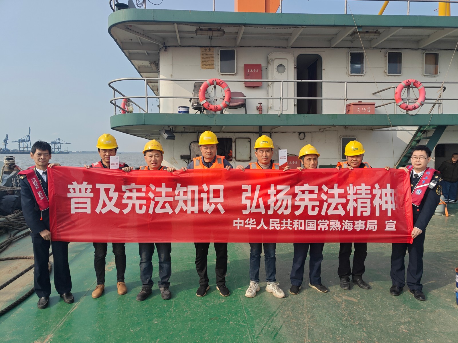常熟海事局通过播放国家宪法日宣传海报、悬挂宣传横幅、制作国家宪法日专题微信推送,营造了学习宪法、宣传宪法的浓厚氛围。12月4日,常熟海事局组织执法人员深入码头、船头、船员考场,开展宪法和国旗法宣传。执法人员通俗易懂地宣讲了宪法与每个人从出生到上学、成年、工作、婚姻、退休等的密切关系,以案释法,指导船舶规范悬挂国旗,现场发放宪法宣传册50份。组织青年干部职工集中开展宪法学习,通过观看宪法公益宣传片、听“大家”说宪法、在线参与宪法宣传周答题,进一步深刻认识了宪法国家根本大法的地位、宪法在治国理政中的重要作用,作为公职人员,自觉增强宪法法律意识,坚定维护宪法权威和尊严,依宪依法依规履职。