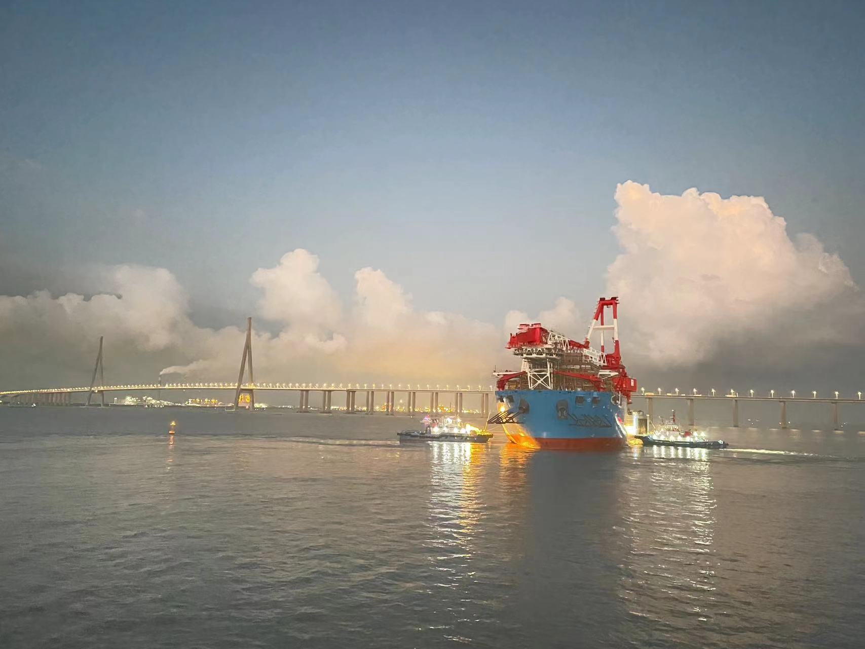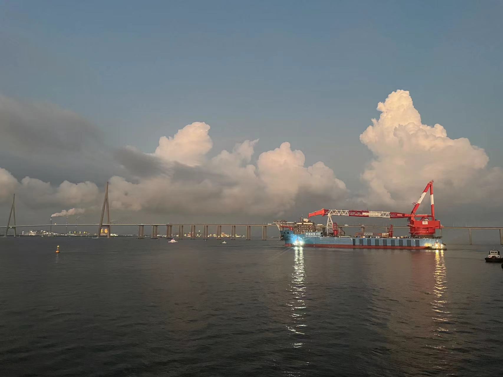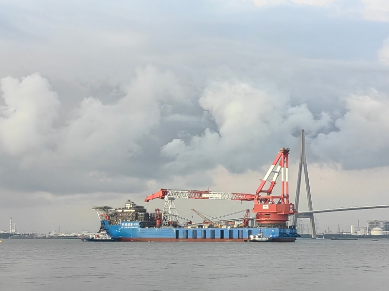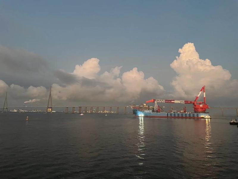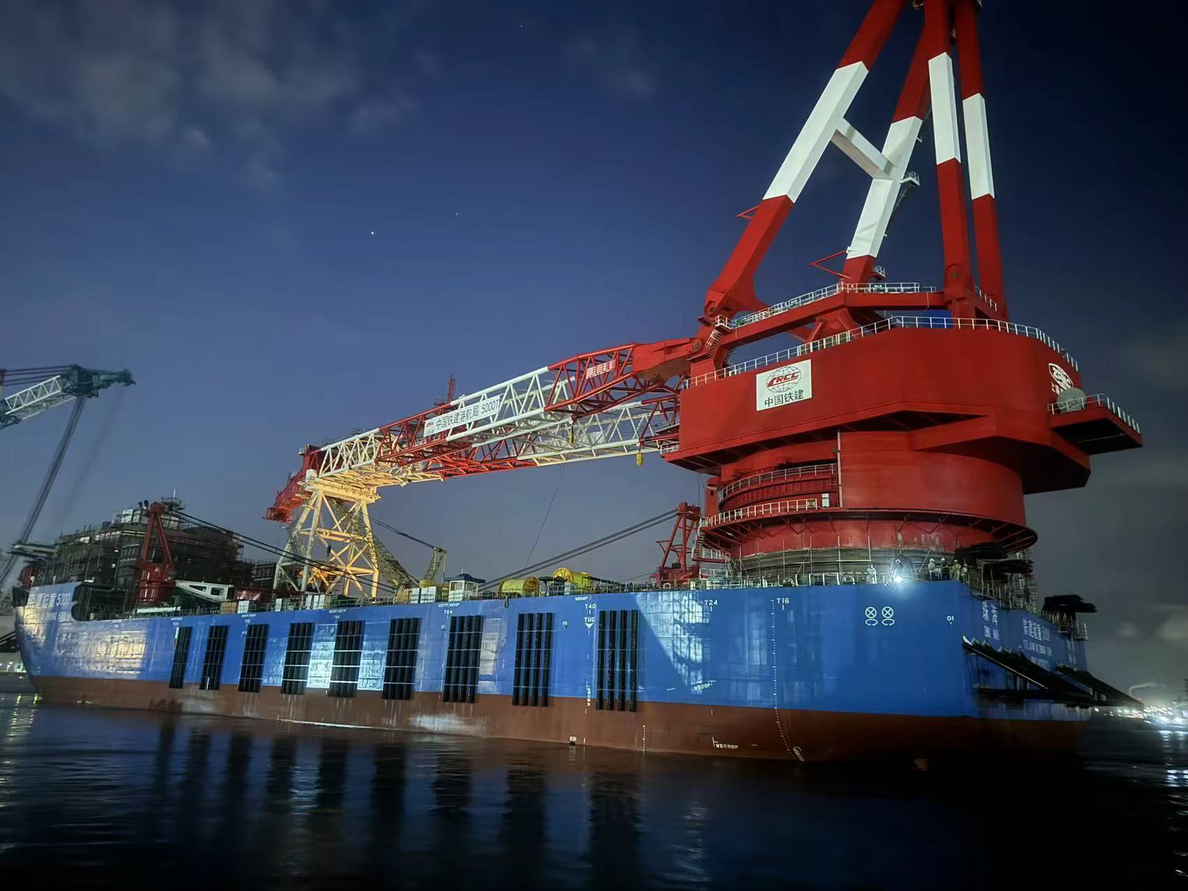 2024年9月9日0730时,在三艘大马力拖轮及海巡艇、警戒艇的全力维护下,中国铁建港航局投资建造的国家风电行业“旗舰”“铁建起重5000”轮在振华重工码头完成吊机安装后顺利回靠海新船厂。“铁建起重5000”轮总长203米,型宽50米,型深18米,最大吊高可至甲板以上130米,是国内首例单钩吊重达到5000吨的起重船舶,是名副其实的“大国重器”。