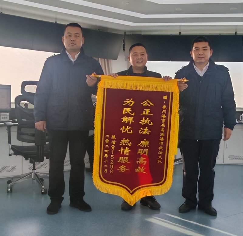 2025年1月7日下午,“豫信货XXX”轮将写有“公正执法、廉明高效、为民解忧、热情服务”的锦旗送至泰州海事局高港海巡执法大队,对高港海巡执法大队高效、优质的服务表示感谢。