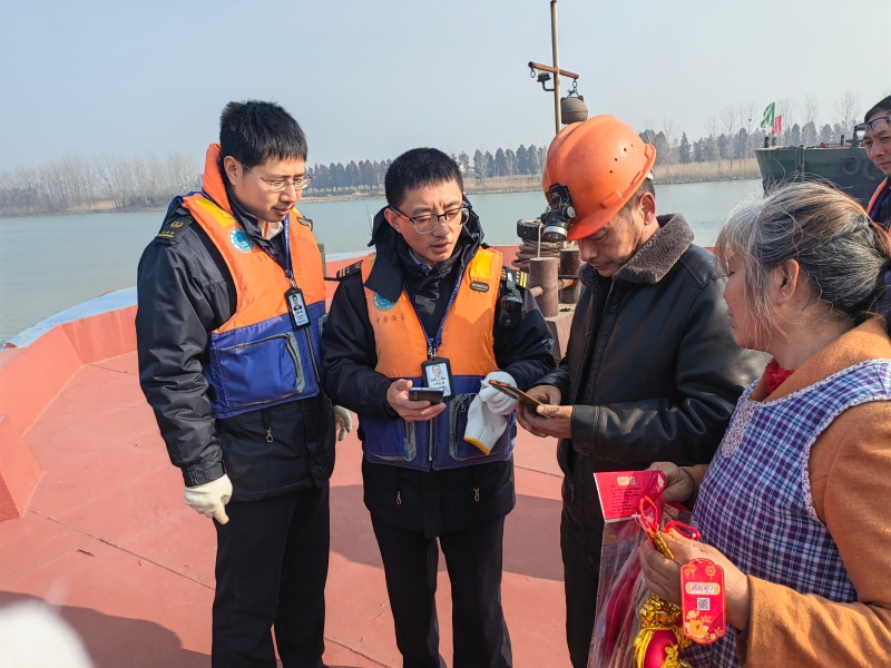首先邀请船员党员参加公开式主题党日活动,学习党的二十届三中全会精神,宣贯《江苏海事局关于印发春运及春节假期安全生产重大风险隐患排查整治行动工作方案的通知》,了解船员在岗动态、值守故事、生活所需。随后,向船员发放春运水上交通安全宣传资料,送上新春福袋和春联“福”字礼包。同时,提醒船员航行过程中密切关注水位变化,合理规划航行路线,确保船只安全返航,让船员切切实实感受到船员行业党组织的关心关爱。