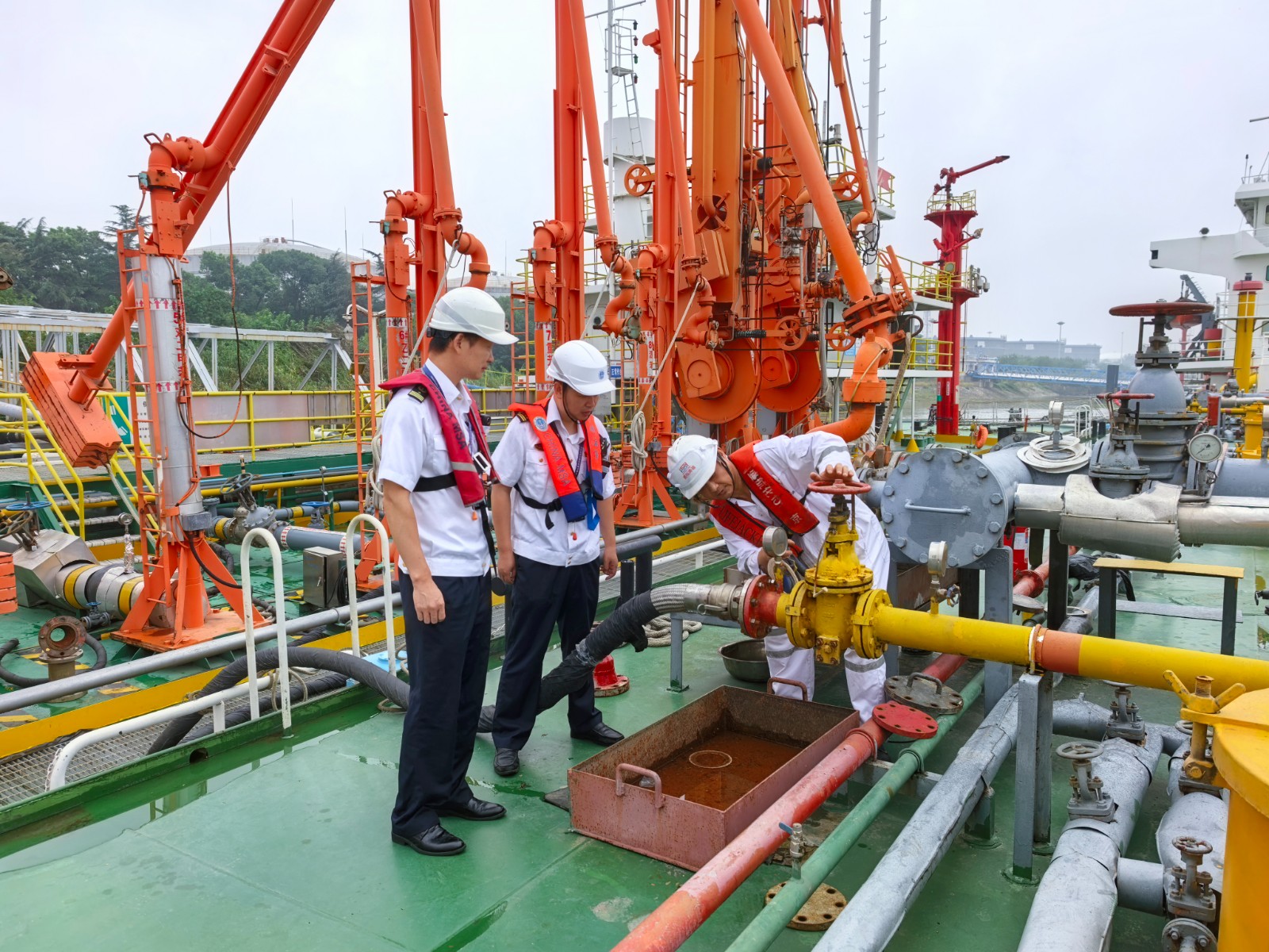 一是动静结合强监管,筑牢安全防线。南京海事局汇集PSC检查官、危防专家等专业力量,研究编制《液货船安全监管指南》明确检查要点,针对辖区国际航行老旧甲醇运输船舶占比高、隐患多的特点,组建危管专业、英语精通的现场检查专班,实现老旧危险品船舶检查100%全覆盖。通过“重案5步查处程序”,即现场检查、处内研判、专家会诊、违法查处、多方通报,精准防控涉外检查风险,有效遏制货物跑冒滴漏、危险区域使用非防爆工具等严重违章行为。