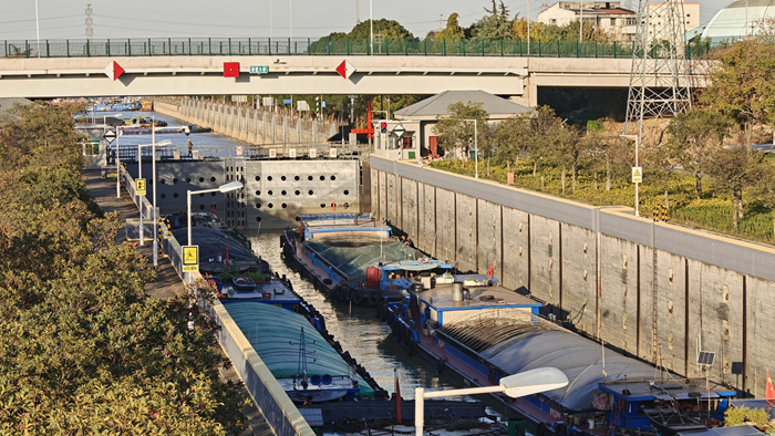 镇江谏壁船闸,满载粮食、建材、煤炭等原材料的船舶有序汇聚,经此船闸可直达苏南、浙北腹地。