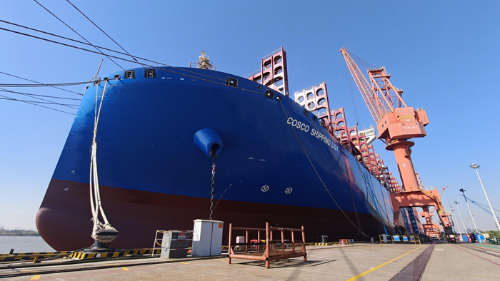 扬州中远海运重工的造船码头,一艘16000TEU甲醇双燃料集装箱船加紧建造。江苏海事局供图