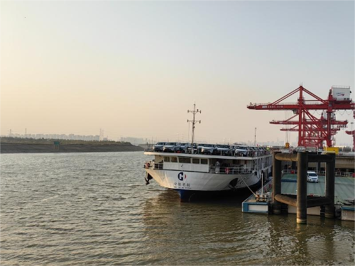 11月24日,合肥派河港码头一派忙碌景象。一辆辆安徽制造的汽车接连驶上“航通07”滚装船,沿江淮运河进入长江,抵达上海后再换装远洋滚装船送往世界各地。