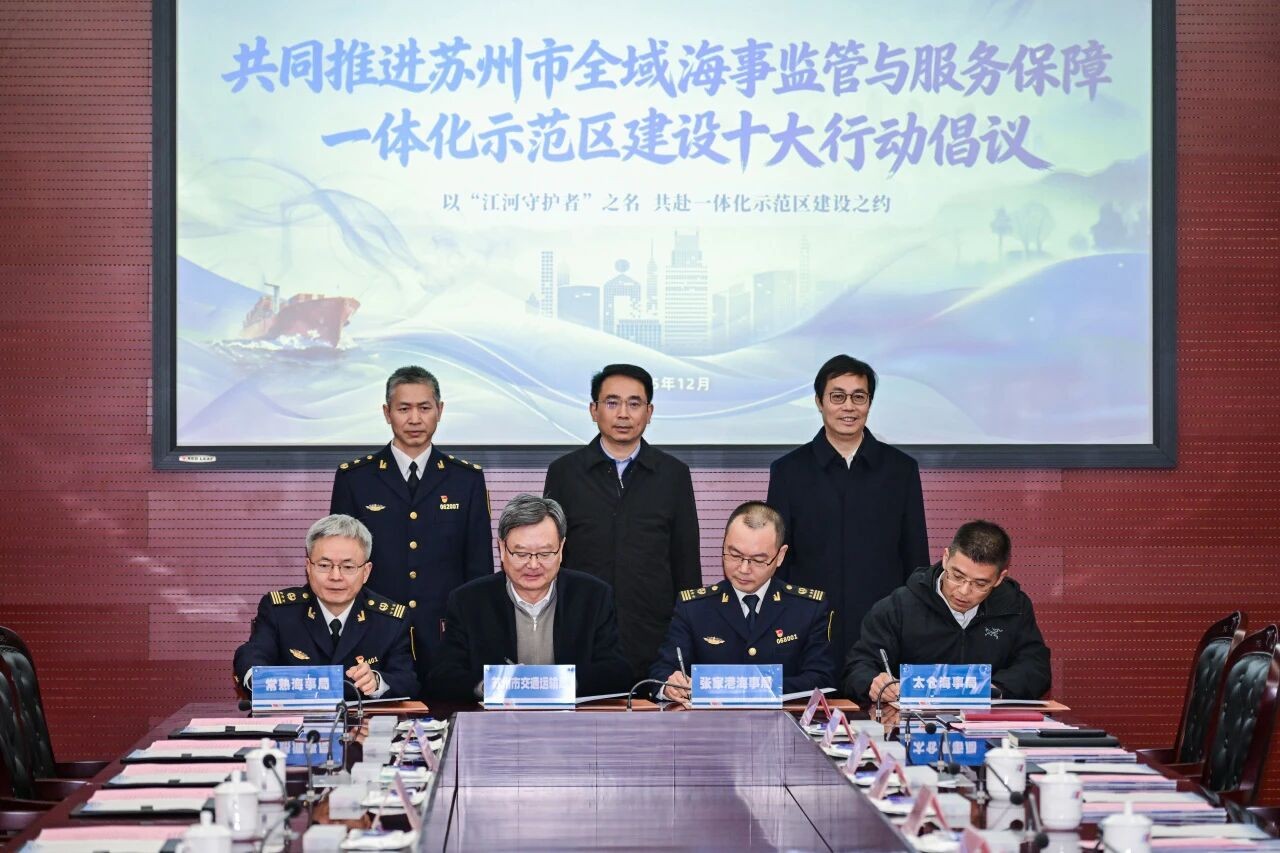 会议以破解交汇水域跨域治理难题为重点,在江苏省交通运输厅党组成员、省交通工程建设局局长宋国森,苏州市人民政府副市长施嘉泓及江苏海事局督办邓振钢等领导同志见证下,张家港海事局、常熟海事局、太仓海事局与苏州市交通运输局共同签署了《共同推进苏州市全域海事监管与服务保障一体化示范区建设十大行动倡议书》。倡议书将长江与内河交汇水域协同治理作为核心着力点,明确提出了共担试点使命、共破跨域难题、共建安全慧眼、共绘数智蓝图、共优服务温度、共塑信用生态、共护水域清朗、共守重点防线、共筑应急屏障、共树示范标杆等十大重点行动,聚力构建全链条协同治理体系,形成可复制的国地海事一体化协同治理“苏州方案”。