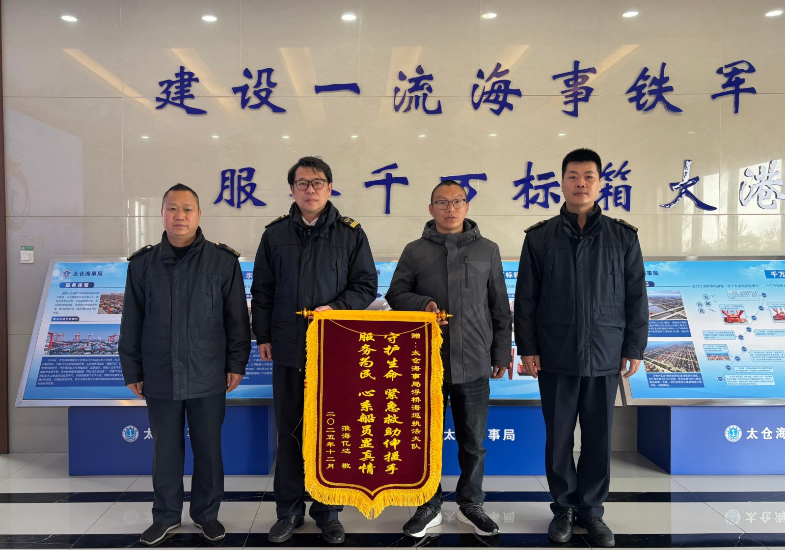 近日,“淮海亿达”轮相关负责人专程来到太仓海事局,将一面印有“守护生命 紧急救助伸援手 服务为民 心系船员显真情”的锦旗送到执法人员手中,感谢太仓海事局于12月16日凌晨对该轮上一名突发胆结石船员的迅速救援,为船员赢得了宝贵的救治时间。