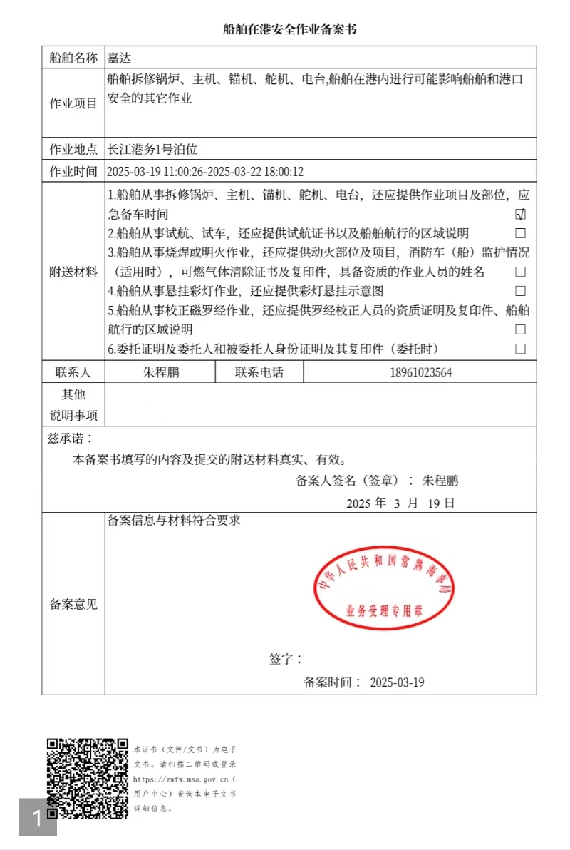 3月19日,常熟道达江海物流有限公司业务员朱某在常熟海事局政务中心工作人员全程指导下,通过海事通APP成功办理了“嘉达*”轮船舶烧焊或明火作业、船舶主机拆修等多项安全作业的一次性集成备案,这是常熟辖区首单运用“海事通”APP开展港区水域内安全作业备案“一件事”业务。
