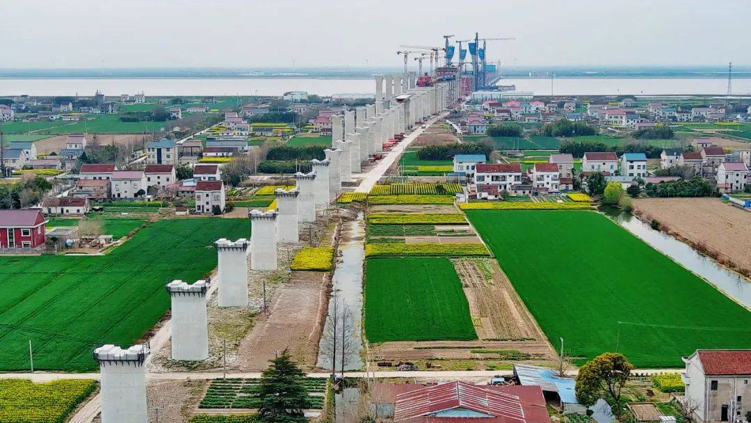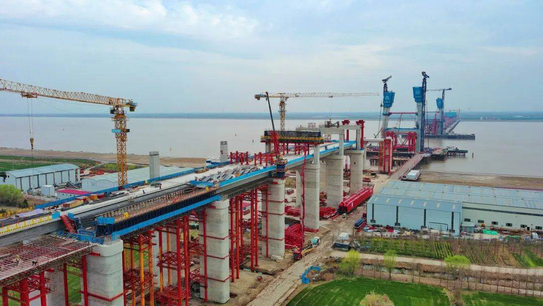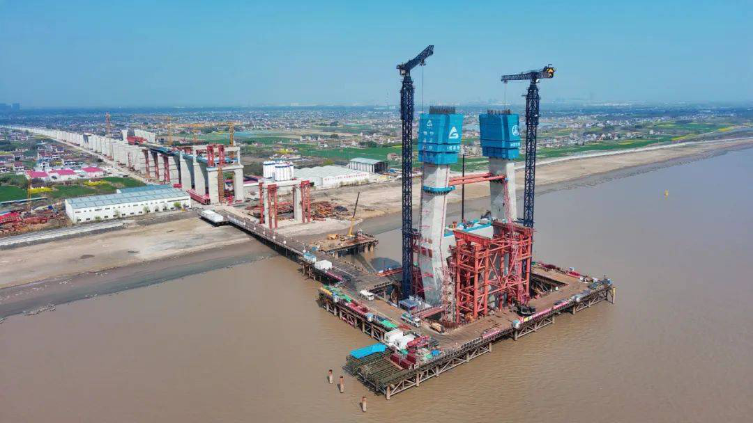 崇启公铁长江大桥为世界上在建的最大跨度双塔双索面公铁两用无砟轨道斜拉桥,是上海至南京至合肥高速铁路重点控制性工程。大桥全长4.09公里,主跨400米,横跨长江入海口北支航道,计划于2025年8月完成主塔封顶,2025年下半年完成非通航孔桥和主通航孔桥边跨钢梁顶推,2025年年底力争完成主桥斜拉索安装、实现全桥钢梁合拢,2026年完成南北引桥和全桥无砟轨道和附属工程施工。