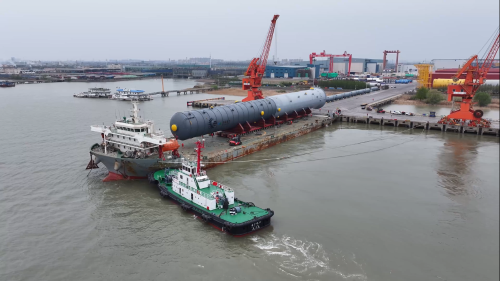 据悉,本次发运的洗涤塔设备总重2500吨,长度达109米,最大直径12.5米,刷新全球同类型设备纪录。该设备主要用于净化气体、回收有用物质,保护设备和减少污染等,是确保装置高效运行的重要环节和核心引擎。张家港海事局高度重视此次护航任务,制定“全流程电子监控+人工巡检”双轨护航方案,确保设备“零缺陷”发运。