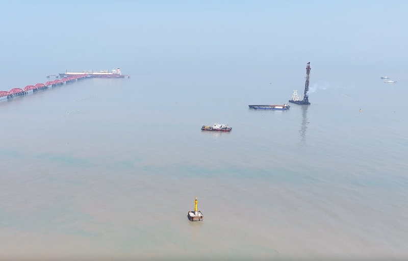 4月9日,如东洋口港阳光岛东北角海域,锤击声阵阵。一根根长达数十米的钢管桩,在机械的轰鸣声中依次精准扎入海中,标志着备受瞩目的江苏LNG项目三期配套码头工程海上桩基施工顺利启动。
