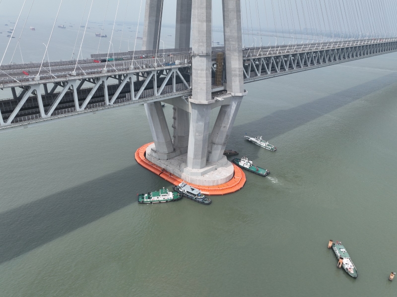 据悉,大桥防撞设施采用钢结构制造+橡胶软体设计,主要由增强橡胶软体防撞圈及钢骨架组成,内部填充陶粒,既确保了结构整体强度,也提供缓冲和吸能的功能。该防撞设施由34个节段拼接而成,每个节段长约6米,节段间采用不锈钢螺栓连接。防撞设施正面抗撞尺度为9.85米,侧面抗撞尺度为7米,为大桥整体结构的稳定性提供了有力保障。
