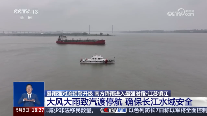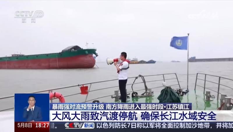5月8日,CCTV-13新闻频道播报了在暴雨强对流天气中,大风大雨致汽渡停航,镇江海事部门积极应对、多措并举确保长江水域通航安全。该报道充分体现了极端天气下镇江海事对防汛防灾工作科学研判、精准管控的良好成效。