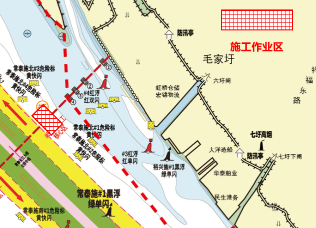 过往船舶可以通过甚高频06频道与施工船舶联系,也可以通过甚高频09频道与常州海事局指挥中心联系。