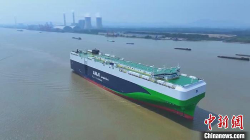 6月14日,9500车级大型甲醇预留汽车运输船“安吉宏盛”轮在江苏扬州交付启航。 扬州海事局供图
