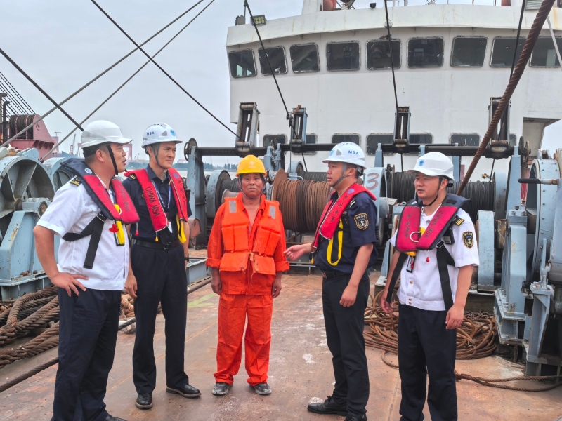 期间,双方针对长江常州段与江阴段交界水域的通航特点,本着“宁可向前一步有交叉、不可后退一步有盲区”的理念,深入梳理了交界水域的监管重点和难点,并就当前存在的问题进行了充分交流探讨;执法人员靶向开展宣传教育,宣贯《江苏海事局关于2025年高温和洪汛期长江江苏段实施特别监管措施的通告》相关内容,重点提升涉水单位及船舶船员应对复合风险意识和能力。对交界水域内作业船舶发放《关于做好2025年高温和洪汛期水上交通安全工作的告知书》,提醒作业船舶密切关注天气和水位变化。在奥德菲尔码头,围绕施工船舶适航条件、船员适任情况、水工申报内容与现场作业内容是否相符等方面,执法人员对码头前沿开展水工作业船舶进行了重点检查;对施工作业安全防护措施落实情况进行了抽查,督促施工方要严格落实安全生产主体责任,严格按照操作规程开展作业,落实好长江洪水期防控措施,做好预警预控。