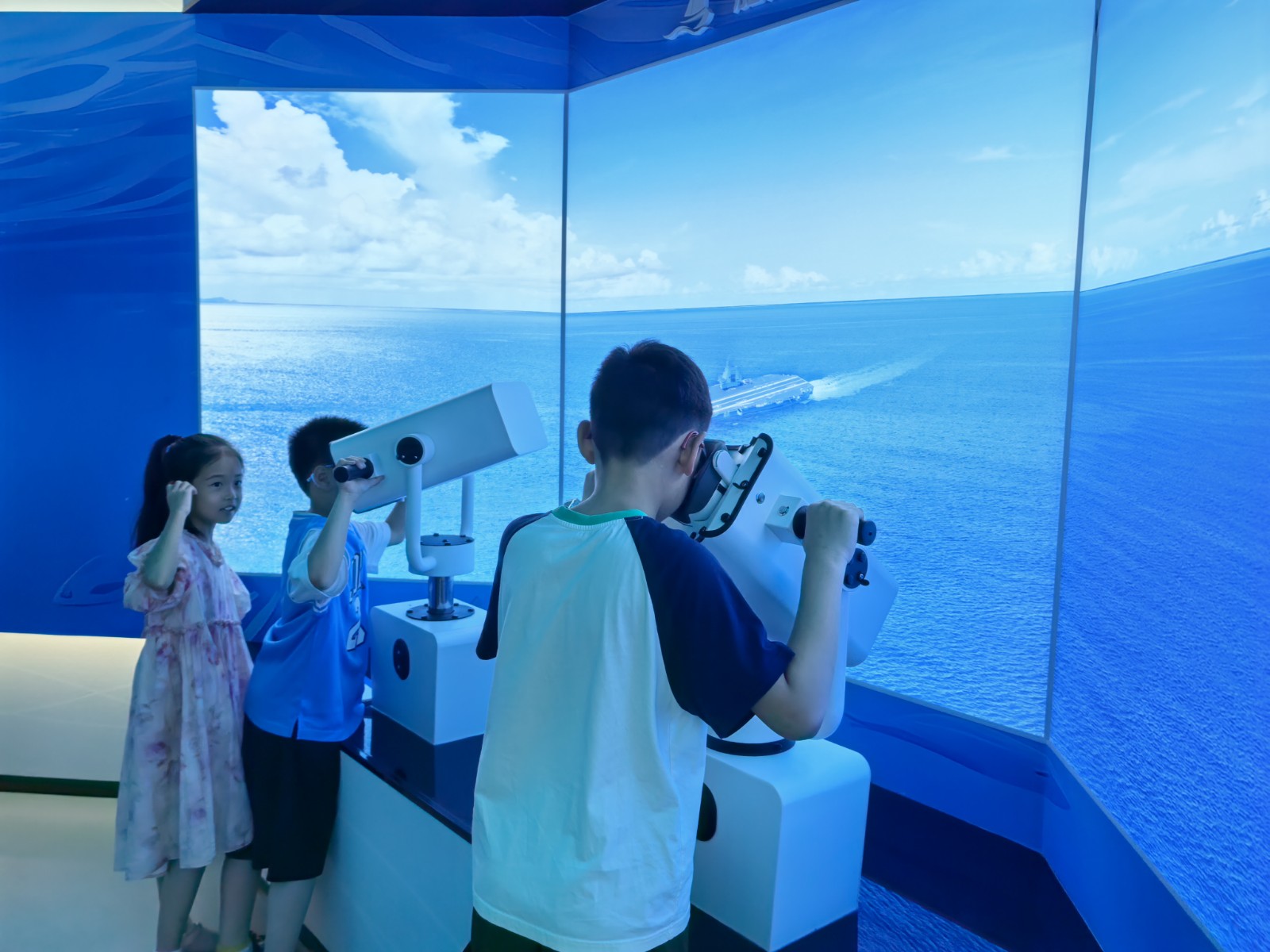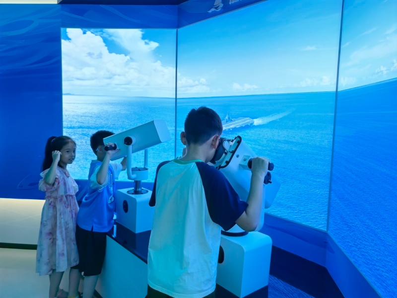 在航空展区,小朋友们了解中国航空事业的发展历史,近距离参观了各类型军用飞机模型,化身小小飞行员,在专业设备上体验模拟飞行驾驶,学习启动发动机、控制飞机起飞、巡航等基本操作流程,感受翱翔蓝天的乐趣。在航天展区,小朋友们系统了解中国航天工程发展历史,感受中国航天事业取得的伟大成就,通过模拟设备体验空间站生活场景,感受了太空探索的奇妙。在航海展区,小朋友们利用VR望远镜设备,化身“蛟龙”号驾驶舱驾驶员,潜入幽暗深邃的海底,身临其境参与科学考察活动,探索神秘的海洋世界,感受那些乘风破浪、勇往直前的航海壮举。在丰富的参观体验活动中,船员和小朋友们不仅学习了航海知识,更对航海文化和精神有了更深的了解。
