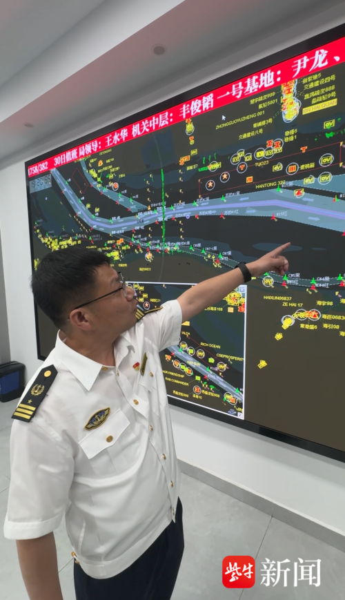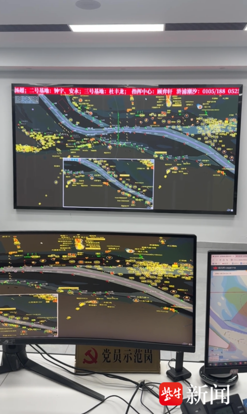 当晚8点,扬子晚报/紫牛新闻记者来到常熟海事局指挥中心,巨大的监控屏幕上,密密麻麻的船舶动态光点与实时跳动的风力数据相互交织,无声展现着江面的紧张态势。窗外风雨交加,室内电话铃声此起彼伏,指挥中心工作人员钱博紧盯着监控屏幕,一边快速处理信息,一边对着话筒沉稳调度:“请确认锚位安全!……好的,注意安全!”这句看似简单的“注意安全”,在过去的6小时里,钱博已经重复了近200次。