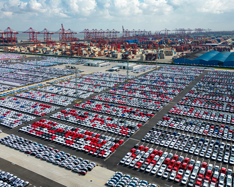 在长江干线规模最大的海通(太仓)汽车滚装码头,堆场上新能源汽车排列整齐、首尾相接,满载车辆的平板车络绎不绝驶入港区,滚装船高效开展装车作业,货物即将发往欧美等海外市场。“近期单日最高进站车辆突破4000辆,日均维持在3000辆左右。”码头工作人员介绍。