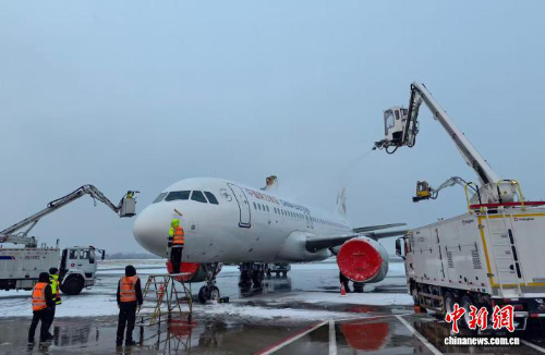 1月20日,中国东方航空江苏有限公司工作人员为飞机开展除冰雪作业。施阳 摄
