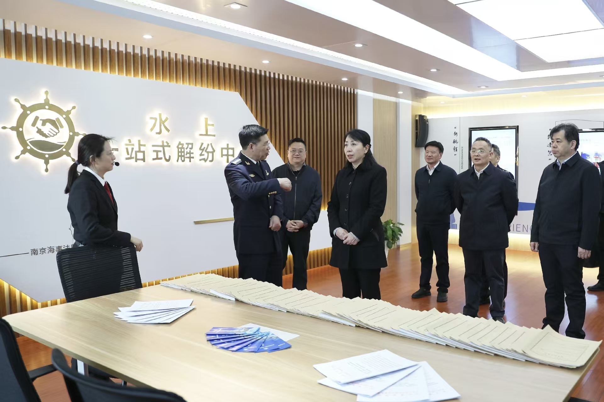 王红卫书记对南京水上“一站式”解纷中心运行成效给予高度肯定,她强调,江苏海事局与南京海事法院协同创新,坚持和发展新时代海上“枫桥经验”,推进社会治理创新,在全国首创“行政调解+司法保障+社会支持”的多元解纷体系,切实将矛盾纠纷化解在基层、化解在源头,为优化营商环境、保障航运安全和高质量发展提供了有力司法服务和保障。她指出,要进一步深化海事行政机关专业优势和司法保障的协同联动机制,着力构建有机衔接、协调联动、高效便捷的海事海商纠纷多元化解体系,在专业上确保支撑有力,在服务上确保精准高效;要切实将司法职能向推动矛盾纠纷源头化解延伸,推动矛盾纠纷源头预防、专业调解和实质化解,努力实现“小事不出船、大事不出港、矛盾不上交”,让当事人省时省心省力;要强化纠纷调解专业化队伍建设,加强专项培训和实践锻炼,为“一站式”多元解纷机制的稳健发展提供人才支撑与智力储备,持续提升水上纠纷化解的专业化、规范化水平。