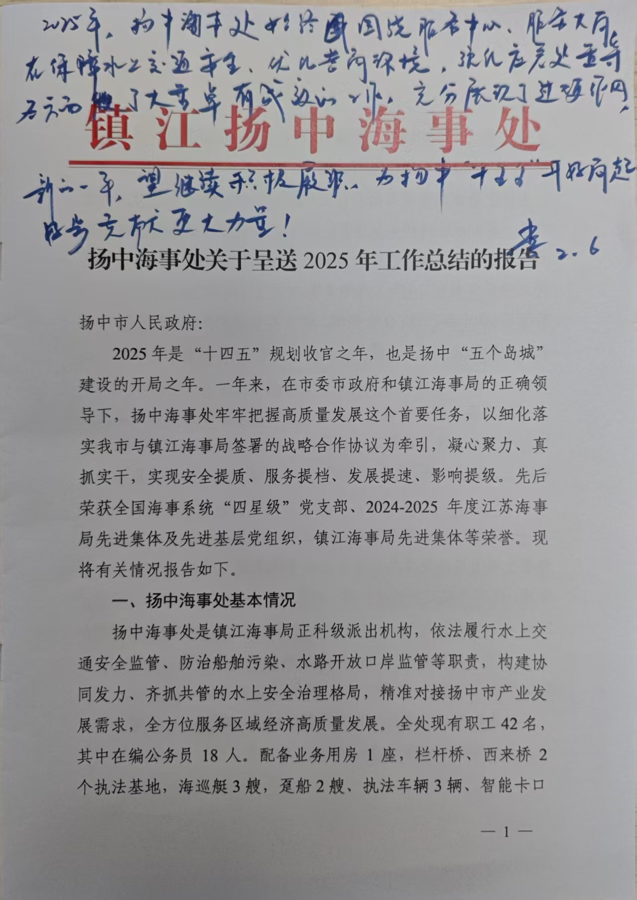 近日,扬中市人民政府李莉珺市长在扬中海事处报送的《关于呈送2025年工作总结的报告》上作出批示,对扬中海事处过去一年的工作给予了充分肯定。