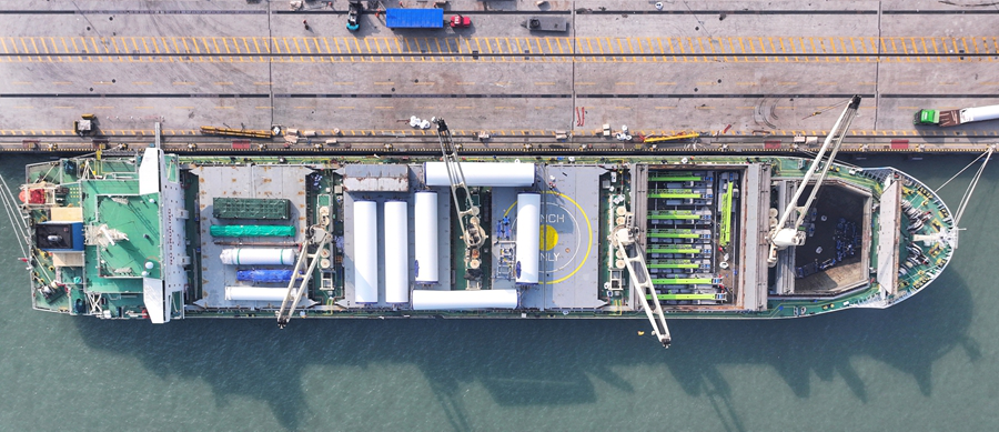 张家港口岸2026年首次出口大型风电设备正在装船。张家港海事局供图