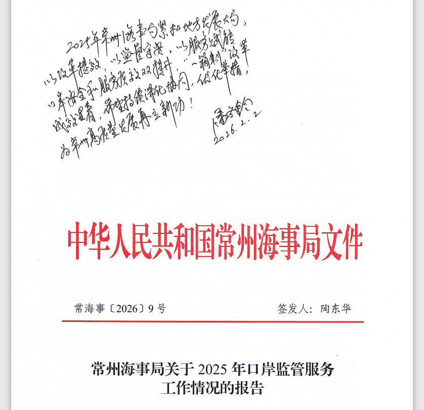 2月2日,常州市人民政府副市长潘冬铃在常州海事局呈送的《常州海事局关于2025年口岸监管服务工作情况的报告》上作出批示,充分肯定了常州海事局2025年口岸监管服务工作,并对2026年工作指明发力方向。