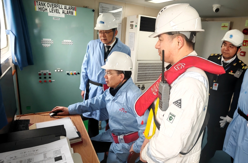 缪昌文局长一行先后对泰州海企仓储码头、泰州益嘉物流航运公司等开展现场督导检查,重点检查了在港国际航行船舶、航运公司等落实商渔船防碰撞工作情况。在海企仓储码头,缪昌文局长带队登上靠泊的国际航行船舶危化品海轮“彩虹岛8”,现场查看有关工作记录、学习记录、航行日志等,通过与在船船员交流,详细了解船舶如何有效落实商渔船防碰撞工作,同时现场听取船员意见建议,此外还重点检查了危化品码头落实“码头长”机制、船岸界面管理等工作情况。在益嘉物流航运公司,缪昌文局长重点检查了公司落实交通运输部海事局“一指南五指引”、以数字化平台开展监控值班、岸基点验提醒等商渔船防碰撞工作情况。期间,缪昌文局长还听取了泰州海事局有关工作情况汇报。