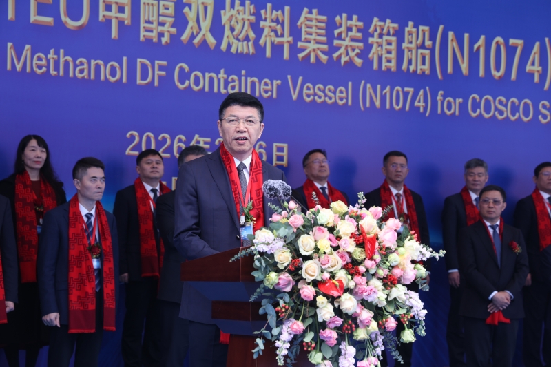 缪昌文局长见证新船命名砍缆仪式并致辞。他指出,当前全球航运业正经历深刻变革,绿色低碳、智能发展已成为船舶工业的核心竞争力。扬州中远海运重工16000TEU甲醇双燃料集装箱系列船不仅是中远海运集团践行航运强国等国家战略的生动实践,更是中国造船业在全球绿色航运赛道上从“跟跑”迈向“领跑”的有力证明,为我国落实“双碳”目标、推动能源结构转型贡献了重要力量。依托中远海运重工等龙头企业的示范带动,扬州跻身高技术船舶国家先进制造业集群行列,2025 年规上船企产值突破五百亿大关,新造船数量稳居全省第一。