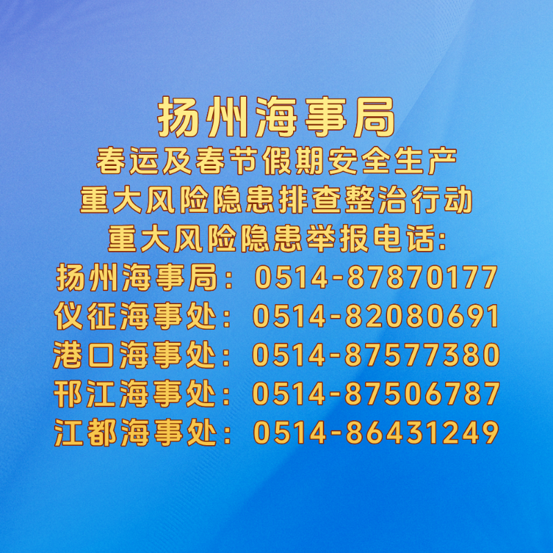 1.扬州海事局 地址:扬州市邗江区国展路19号; 电话:0514-87893827。 2.扬州港口海事处(施桥海巡执法大队) 地址:扬州市邗江区滨江路扬州港5号门对面; 值班电话:0514-87571951。 3. 扬州广陵海巡执法大队 地址:扬州市广陵区李典镇新坝村横...